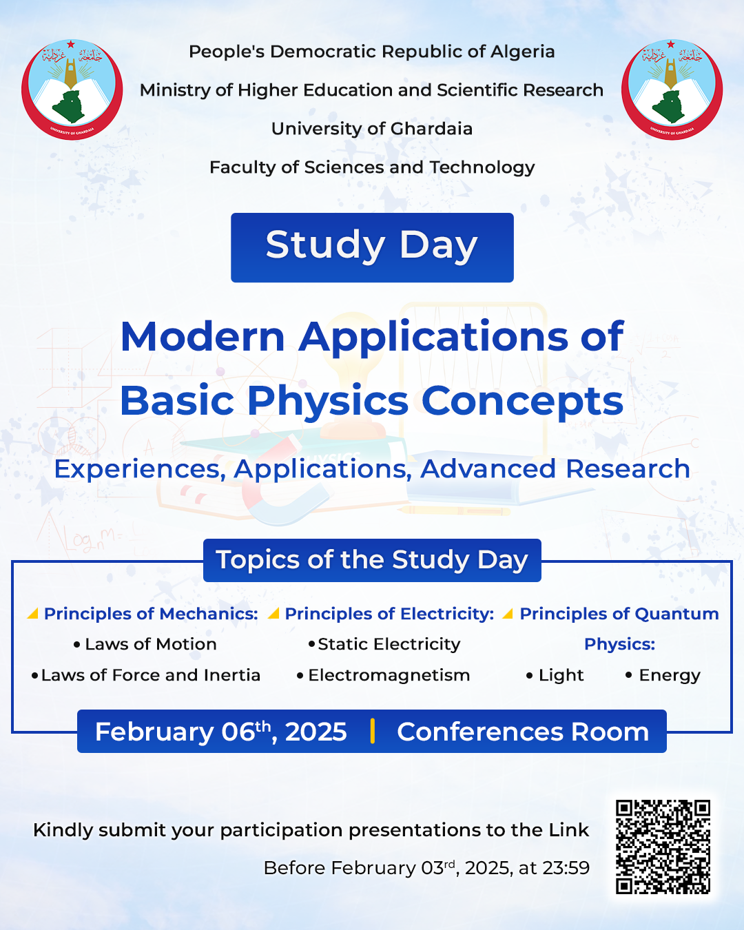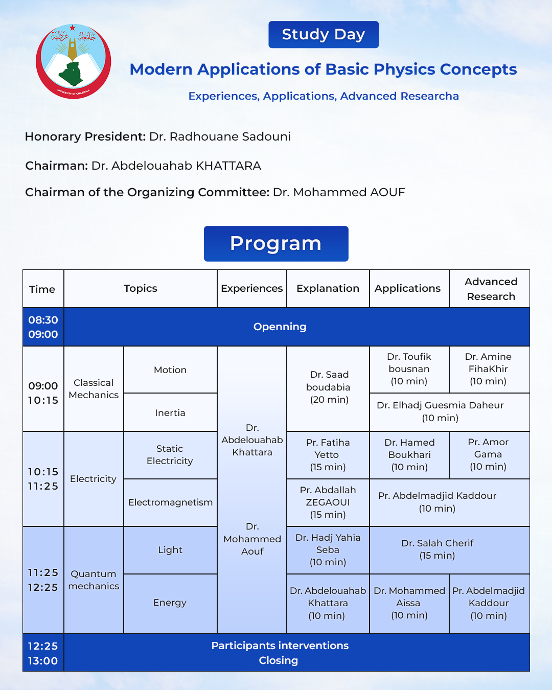 study day of basics physics consepts :experiences qpplicqtions advanced research principles of mechanics .principles of electrycity ;principles of Quantum
