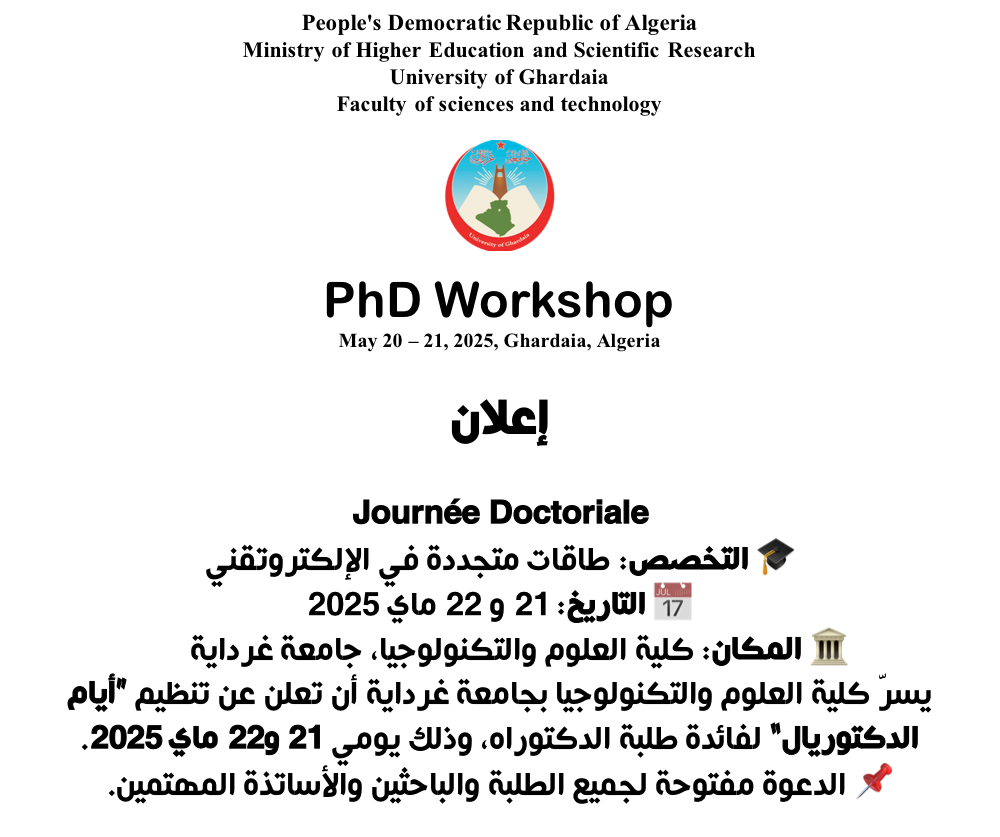 ايام دكتوريال تخصص طاقات متجددة في الاكتروتقني لجميع الاسات\ة والباحثين المهتمين بكلية العلوم والتكنولوجياايام 21 و 22 ماي 2025